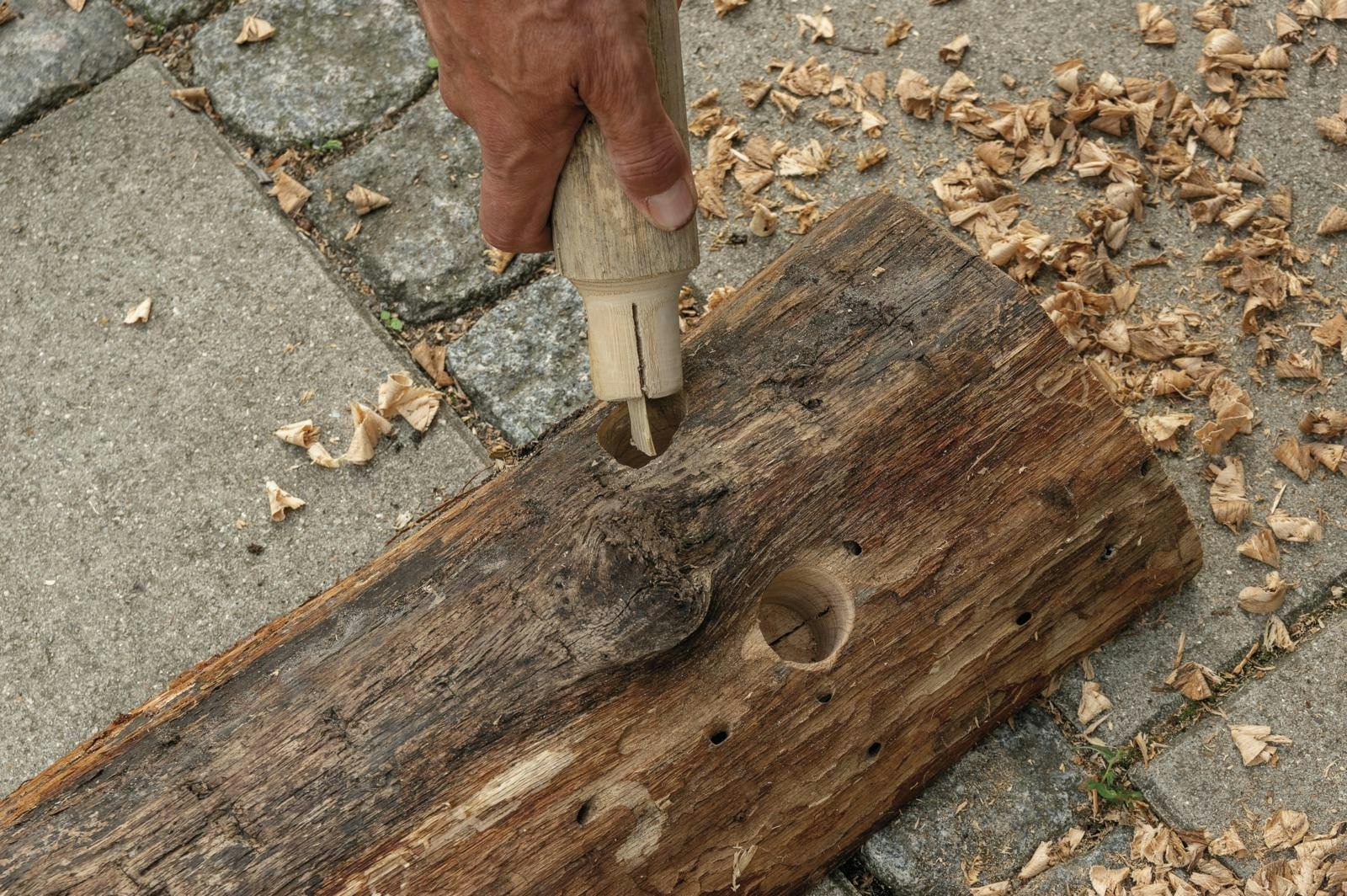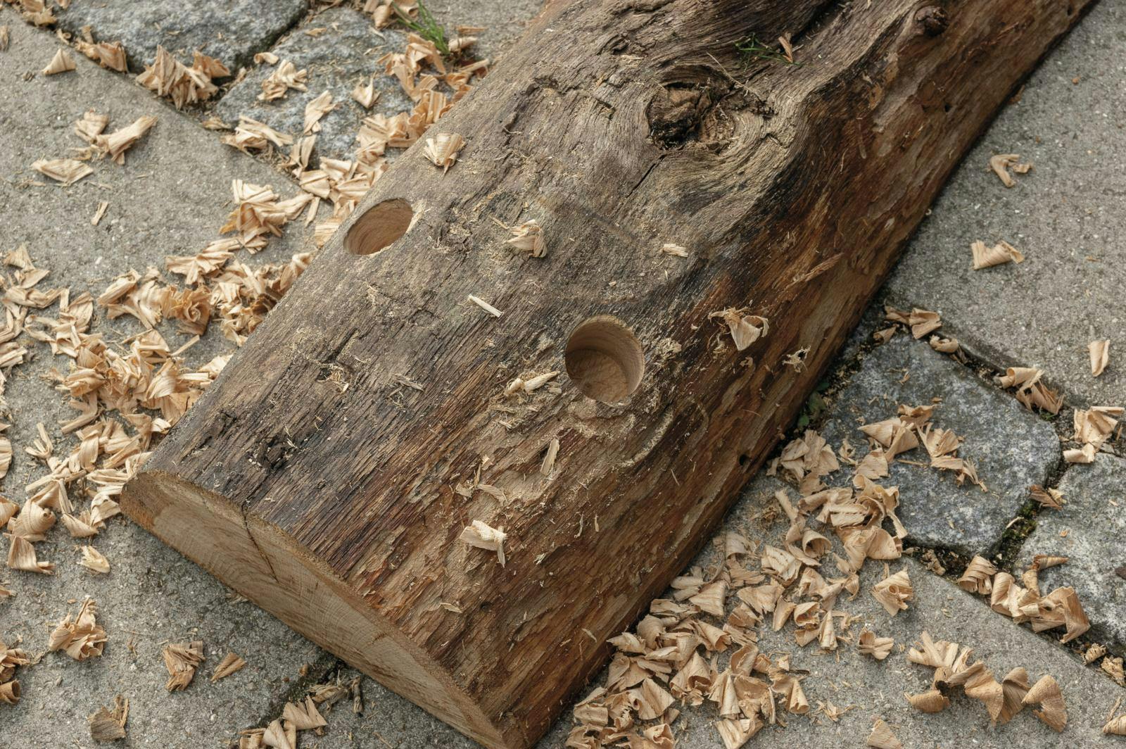 For at benene kan sidde fast på stammen, skal du lave en tap på ca. 4 cm i den ene ende af hvert ben. Tappene laves nemmest med et tapbor, men du kan også forme tappen ved at hugge den ud med en økse og kniv.