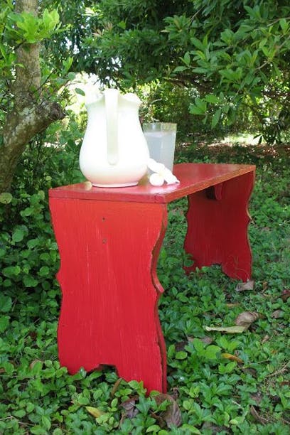Giv din lille bænk en omgang rød maling og stil den på en bar plet i din have. Charme og stil på et minimalt budget.