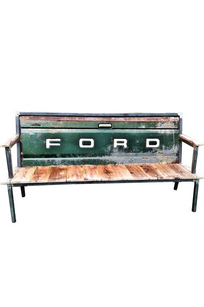 Upcycling er klart det nye sorte. Her er en kasseret last fra en Ford lastvogn anvendt som ryglæn på en flot bænk.