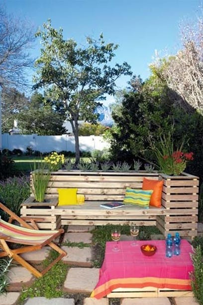 Skab en strandstemning i haven ved at bygge en bænk i træ, der også har plads til blomster og grønt, og placer dem sammen med en havestol og et lille bord.
