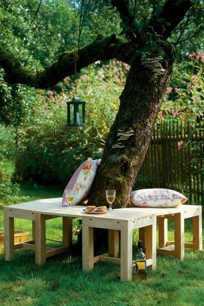 Elsker du også dit træ i haven? Hvorfor ikke give det maksimal kærlighed og bygge en siddeplads rundt om? Her er plads til mange gæster, og der er plads til at slænge sig hen med sin bog.