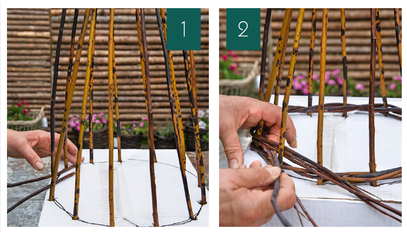Flet grenene foran og bag om grenene i grundstativet. Ved 4. gren i grundstativet sætter du endnu 2 pilegrene under de andre for at gøre flettearbejdet tykkere. Fortsæt med at flette foran og bag om grundstativet 3½ omgang – sæt løbende nye flettegrene ind, så der hele tiden er 4 flettegrene, for ellers bliver flettet for spinkelt til et stativ. Du skal flette 4 omgange i alt – den sidste halve omgang er uden ekstra pilegrene, da fletværket skal afsluttes. Fæst enderne ved at stikke dem ind i fletværket.