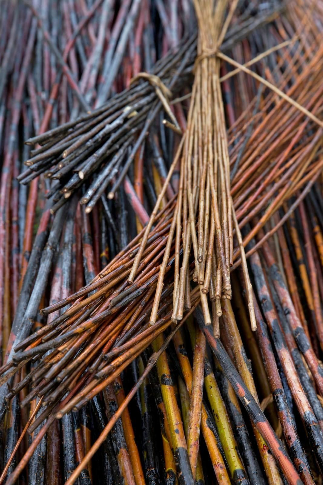 Vi har brugt 13 meget kraftige pilegrene til grundstativet, der er 1 m lange, og et bundt tyndere i forskellige farver til at flette med.