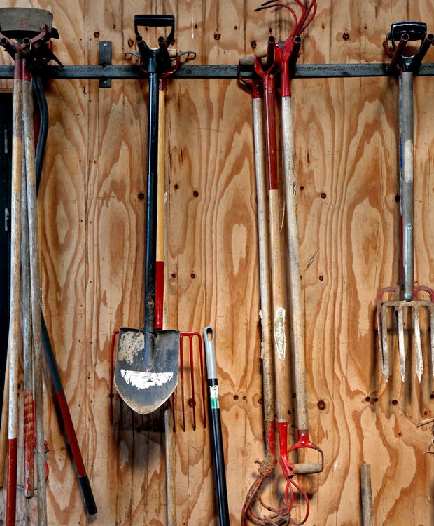 Hvis du vil gøre noget godt for dig selv, og dine redskaber, så hæng dem op på hver sin krog - det er pænere og mere praktisk, og så skramler de ikke imod hinanden. Det kan føles helt forkert, at stille den nyslebne spade på kanten. Det er bedst for alle, at redskaberne kommer op at hænge. De eneste der taber, er musene, der ikke uden videre kan snuppe hår fra kosten til deres rede, eller tygge i ledninger og haveslange.