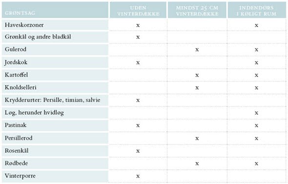 I de gode gamle dage var det almindeligt at sylte, henkoge, mælkesyregære og tørre afgrøderne, så de kunne holde sig vinteren igennem. Men man var også smart og lod de afgrøder stå, som kunne holde til det. Resten blev typisk opbevaret i kasser eller kuler af halm eller sand, der sikrede afgrøderne mod frostskader og udtørring. Med udvalgte afgrøder vil du hver dag kunne tage en tur ud i det råkolde vejr og høste løs af dem hele vinteren.