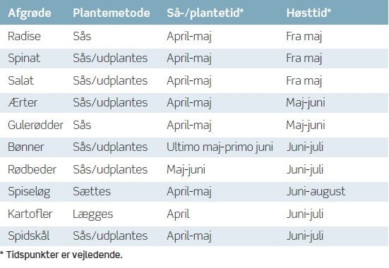 Nogle grøntsager er nemme at så og giver et godt udbytte, mens andre er mere krævende, og høsten kan være usikker. Vælger du de nemme (se skema), kan du selv med et lille tidsforbrug høste friskt spiseligt grønt. Radise er en af de tidligste grøntsager, du kan så og høste. Husk at tynde ud mellem planterne. Hjemmedyrkede radiser smager stærkt og godt! Andre tidlige, nemme og hurtigvoksende grøntsager er spinat, salat, gulerødder og ærter. Hvis du vil forlænge høstsæsonen, kan du så dem ad flere omgange, så du kan høste flere gange i løbet af sæsonen. Spiseløg som gule løg, rødløg og zittauerløg er også en nem afgrøde, du kan høste af til salatskålen. Løgene sættes i april-maj og kan høstes juli-august.