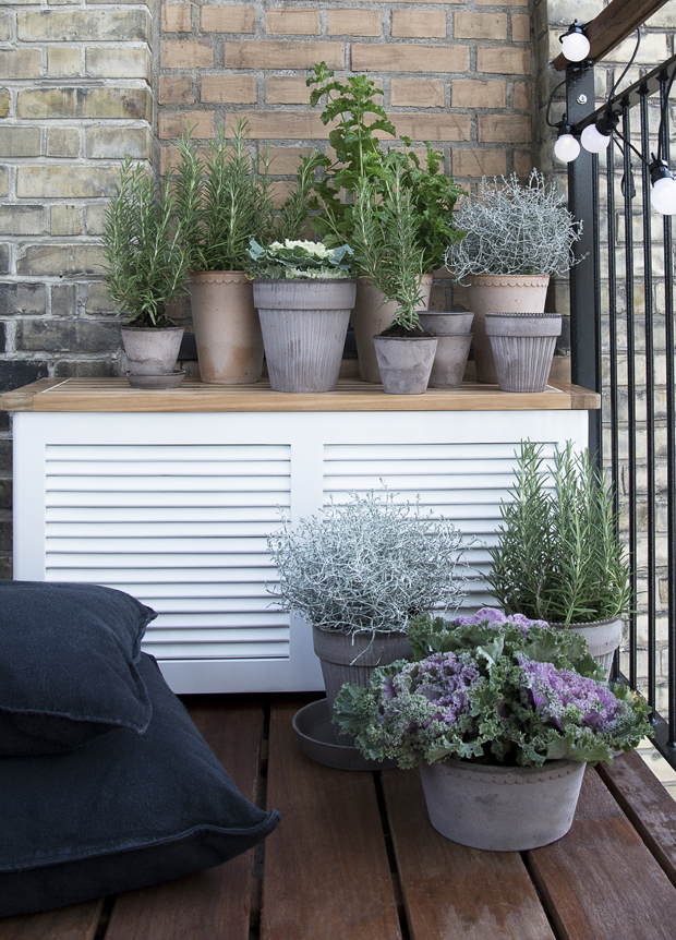 - Hav masser af gran, rosmarin og andre planter eller krydderurter på altanen, der kan tåle frost for at skabe en grøn og hyggelig atmosfære.