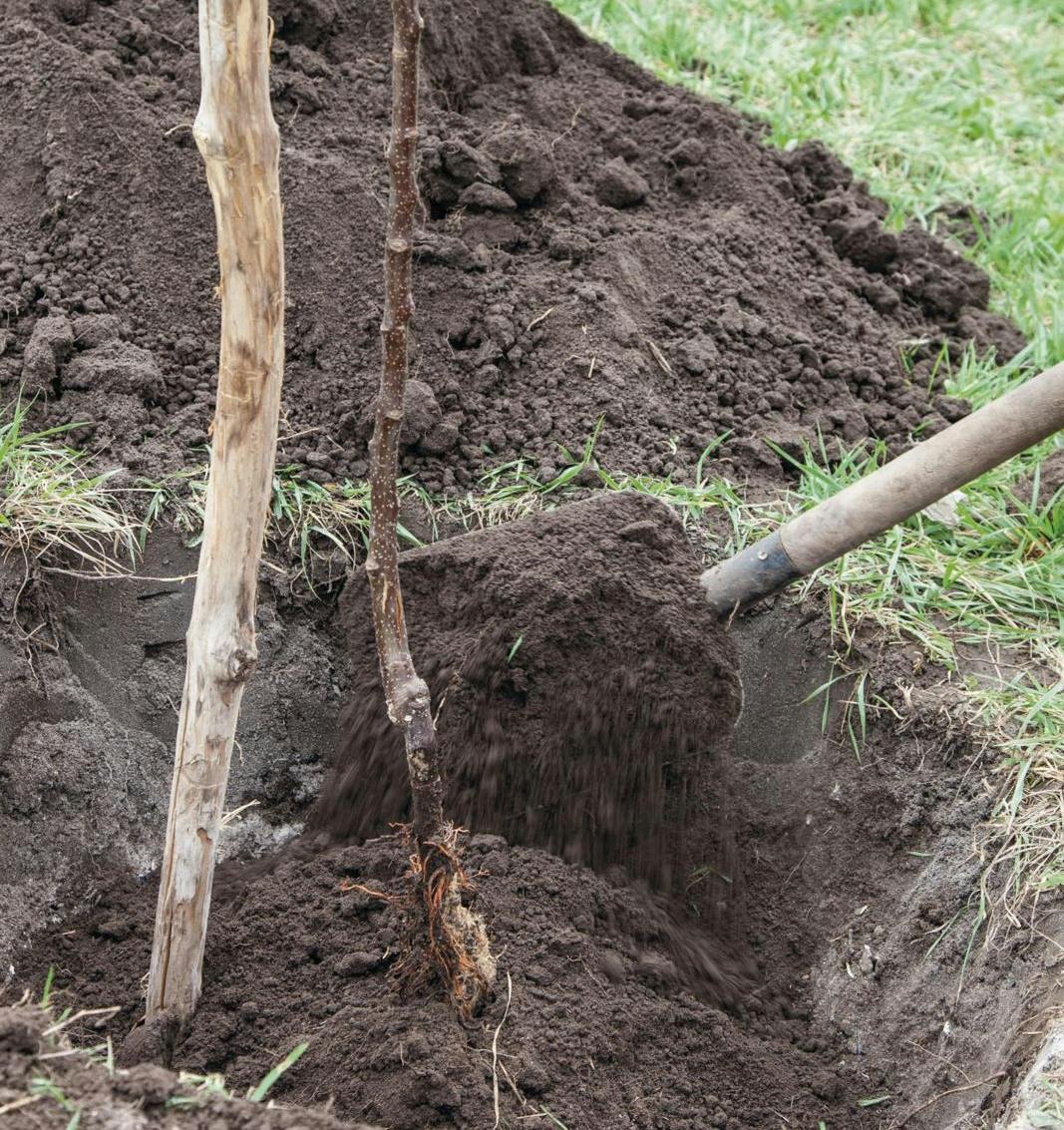 Plantehullet skal være omtrent dobbelt så bredt som rodklumpen og tilpas dybt til, at alle træets rødder kan komme med ned i jorden. Fyld godt op med kompost og næringsrig muld.