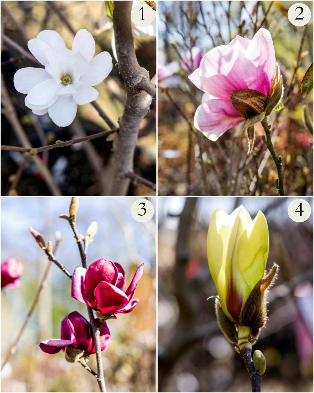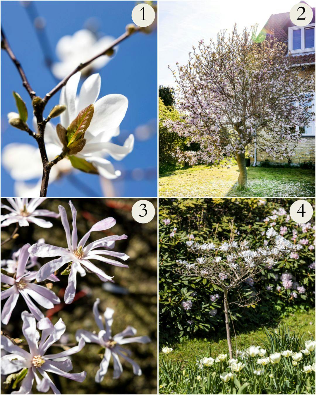 Almindelig magnolia, Magnolia x soulangeana. Denne velkendte art er en krydsning, og der er mange forskellige sorter og farver inden for gruppen. Nogle er svagt voksende, mens andre bliver til større træer. Soulangeanasorterne blomstrer, før bladene kommer frem. Hovedblomstringen er i april-maj, men de kan blive ved med at producere blomster et godt stykke ind i juni.