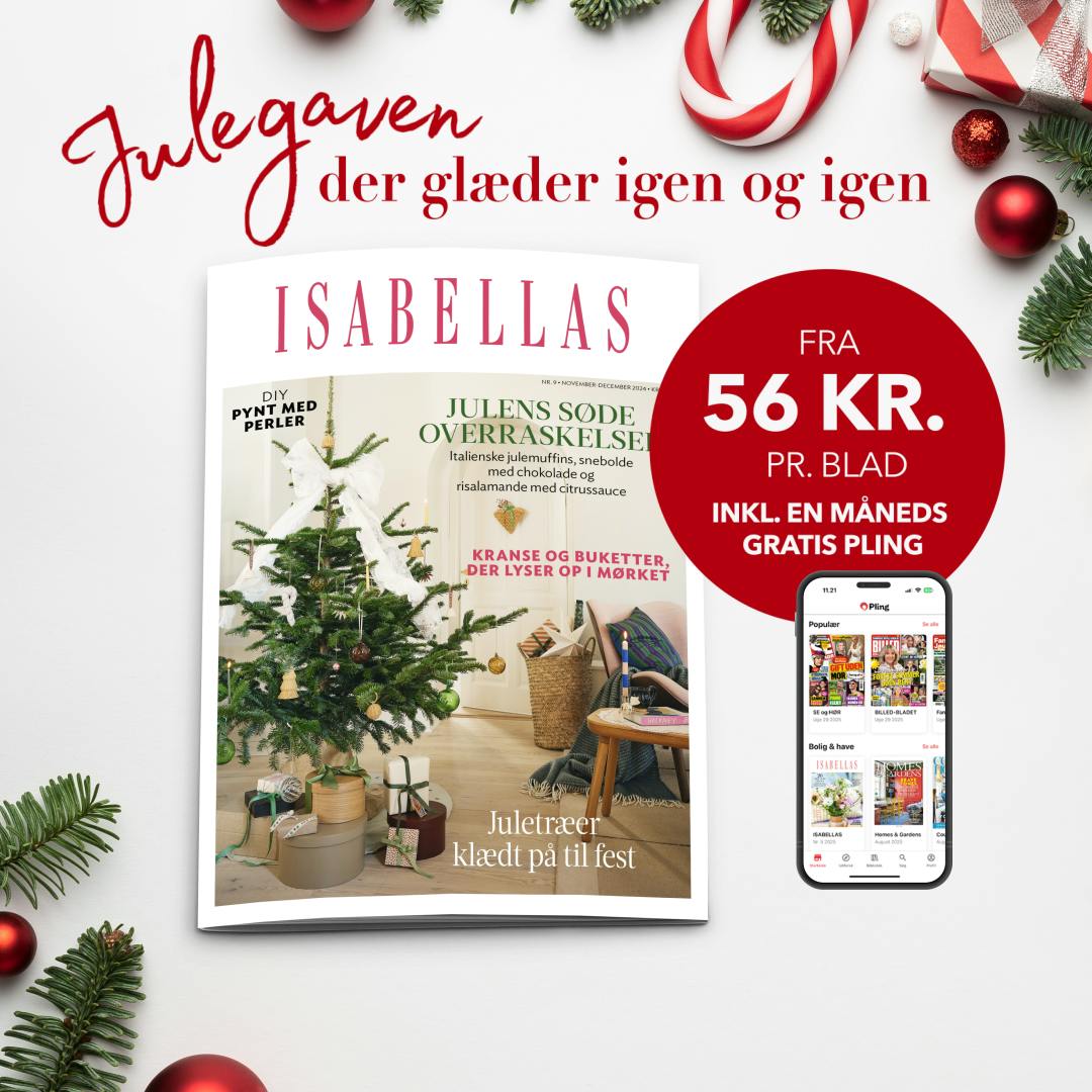 Vi elsker julen, og vi elsker at forkæle dem, vi har nært. Du kan gøre det samme og forære et gaveabonnement på ISABELLAS uden binding. I abonnementet får gavemodtageren mindst seks magasiner og en måneds gratis Pling, som giver digital adgang til mere end 1.000 blade – både danske som internationale.