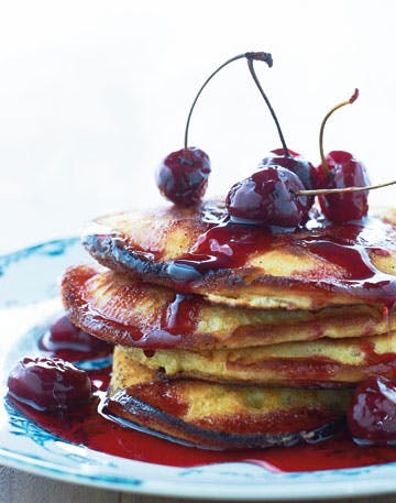 Kog vand, sukker og vaniljestang og -korn til en sukkerlage. Tilsæt kirsebærrene, når sukkeret er smeltet, og lad dem koge i 2 minutter. Afkøl bærrene i lagen. Varm en pande op med lidt smør og olie. Hæld dejen på i klatter, og bag pandekagerne i 2-3 minutter på hver side, til de er lækre gyldne. Server de lune pandekager med marinerede kirsebær til.