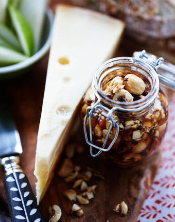 Rist hasselnødderne i en 200° varm ovn i ca. 6-8 minutter, til de begynder at dufte. Afkøl nødderne, og gnid den tynde hinde af dem. Hak dem groft, og hæld dem i et patentglas. Hæld sirup over, og luk til. Anret ost og hasselnødder i glas på et bræt med pære skåret i tynde både. Server også speltbrødet til denne ret.