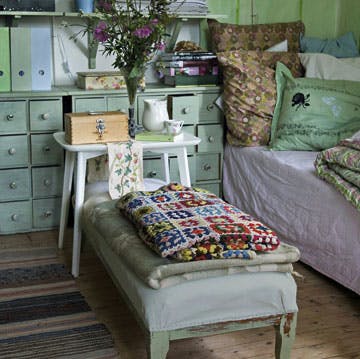 Et svenkrødt hus på en vildtvoksende grund med en blinkende sø i Småland i Sverige. Læg dertil loppe- og genbrugsfund, arvestykker og en kreativitet skaberglæde ud over det sædvanlige. Hvad Dorte Christiansen ikke syer, maler hun, og hvad hun ikke maler, det dekorerer hun.