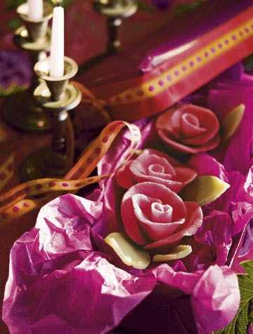 Find en gammel æske eller anden emballage fra gemmerne. Beklæd den med smukt papir. Fyld den ene del af æsken med silkepapir, pynt den anden del med sløjfebånd, og brug den som låg. Fyld æsken med marcipanroser, og læg forsigtigt låget på uden at klemme roserne. (Indpakningspapir fra IKEA. Silkepapir fra Panduro Hobby. Sløjfebånd fra Handler).