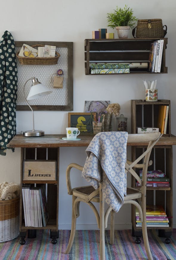 Æblekasser kan bruges til meget mere end bare frugt. Brug som her en enkelt trækasse til opbevaring på væggen, eller kast dig ud i at lave en rustik skoreol eller et sengebord ved at sætte flere kasser sammen.