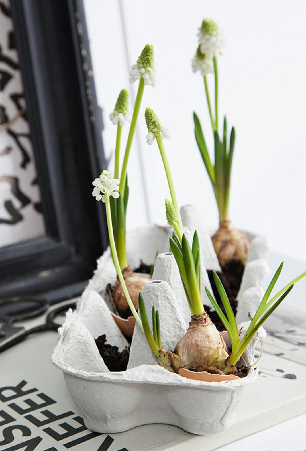 Sådan gør du: Plant dine løgvækster i jorden direkte i æggebakken eller supplér med et par æggeskaller i bakken. Plant evt. forskellige løgvækster i æggebakken og skab en skøn forårsstemning.