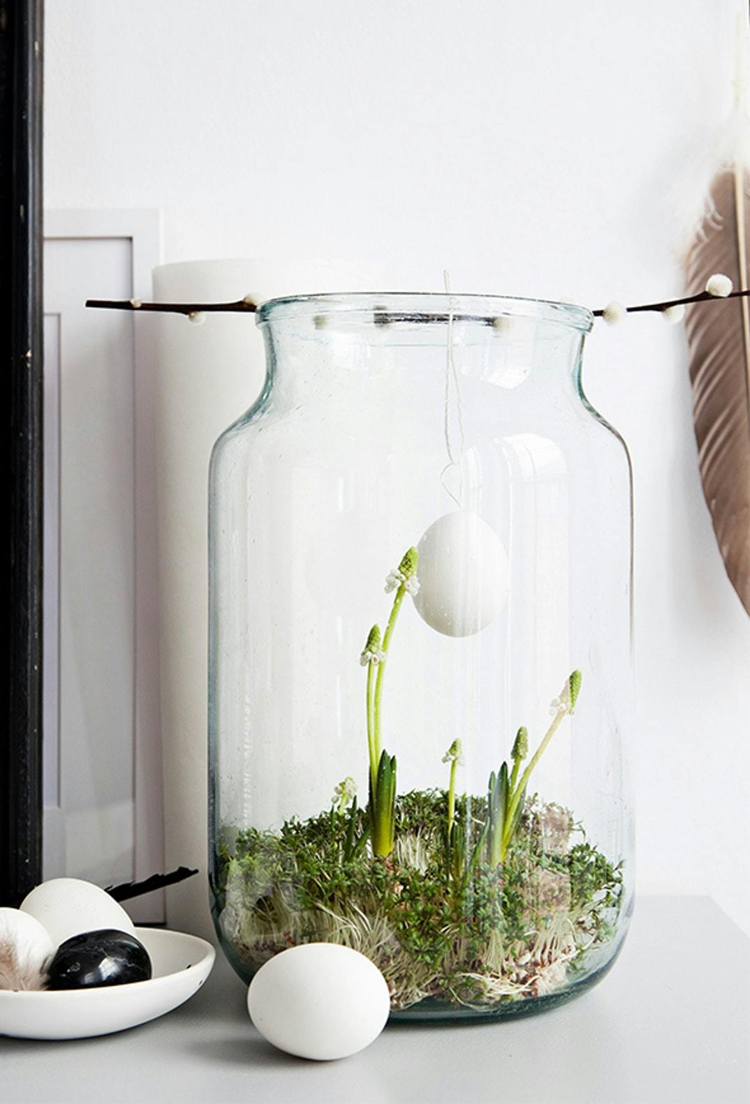 Sådan gør du: Lav dit eget lille væksthus, som er inspireret af årets højtider. Plant karse og perlehyacinterne i vat i bunden af glasvasen. Læg en gren over glasvasens top, og hæng et udpustet æg ned fra grenen.