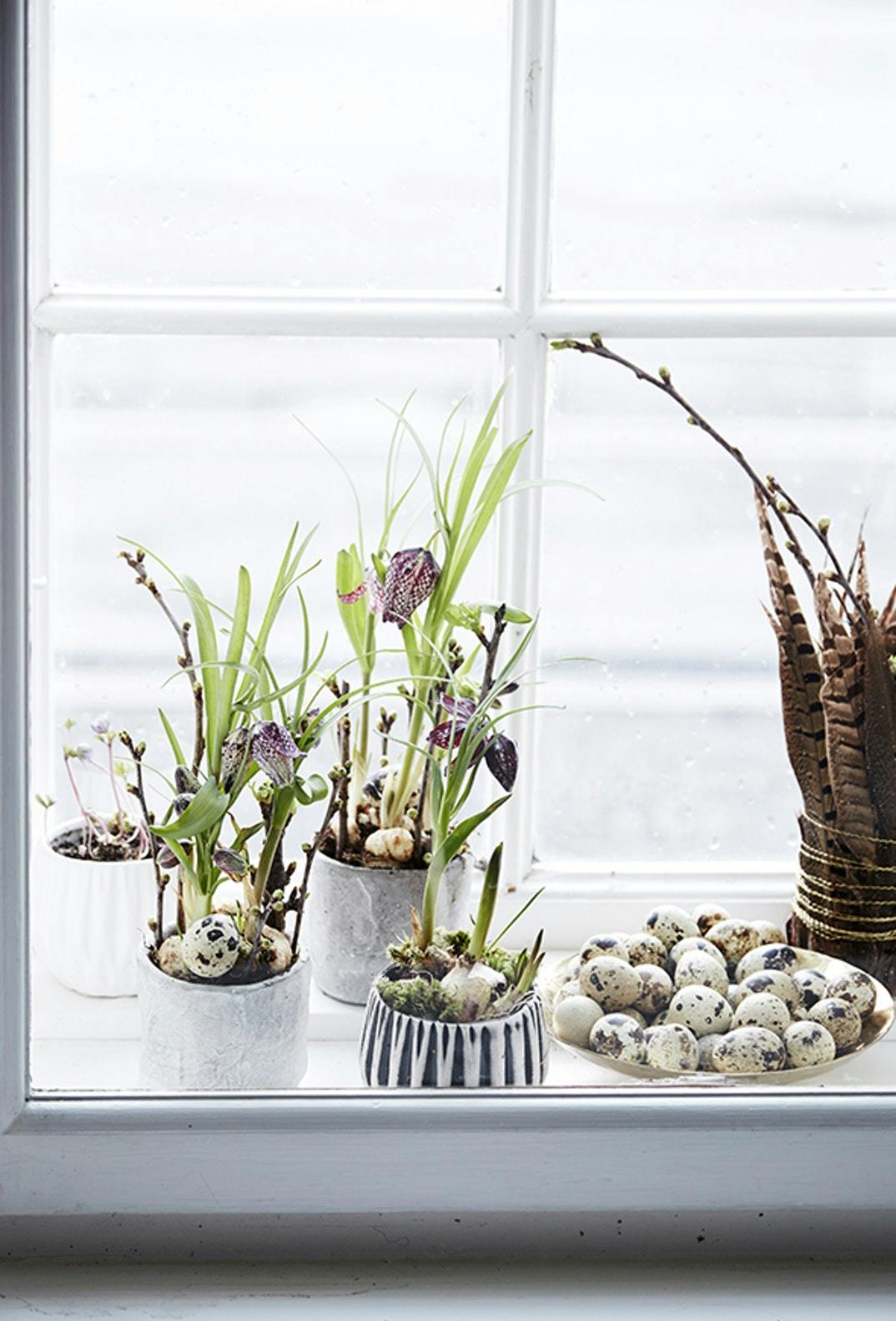 Sådan gør du: Plant dine påskeblomster i de små kopper og krukker du har stående. Stik afskårende grene i hist og pist til du er tilfreds. Pynt dekorationen med mos og vibeæg, og stil dem samlet i en gruppe eller som en del af et stilleben.