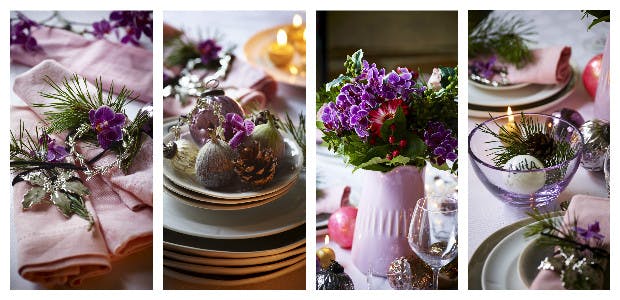 Vi har valgt at dække op med hvid dug og klassisk stel og glas. Blomster og pynt er holdt i rosa og lilla toner. På bordet ligger lidt kogler, udvalgte julekugler, hele figner og små levende lys. I vasen står en buket af lyserøde roser, lilla orkidéer, grene med røde bær, rød gerbera, kristtorn og lidt gran. Om servietterne har vi bundet fine sølvvedhæng fra Rosendahl sammen med gran og lilla orkidéer, der holder sig rigtig godt. De smukke skåle til risalamande fungerer også som bordkort med gran og julekugler i. På julekuglerne har vi skrevet navn med guld-, sølv- eller sort tusch. Kuglerne kan evt. gemmes til senere og bruges til at trække navne, når der skal hentes gaver under træet. Mere inspiration: Juleborddækning