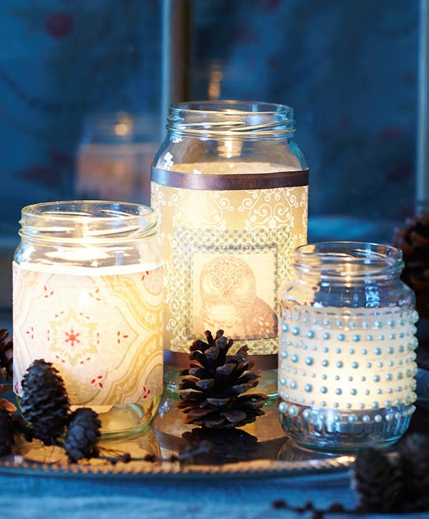 Der er ikke noget, der skaber stemning og hygge, som levende lys i efterårs- og vintermørket. Og når du genbruger dine sylteglas og ketchupflasker og kombinerer dem med enkle ting som silkepapir, perler, sølvglimmer og spraymaling, kan du meget nemt og hurtigt lave fine og personlige lanterner til de levende lys. Alle de materialer, du skal bruge til dine lanterner, kan købes i hobbyforretninger.