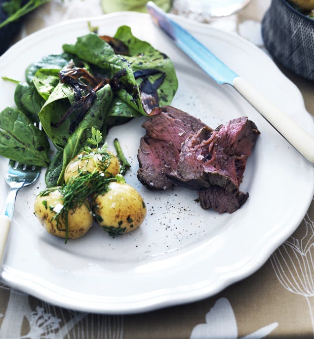 I stedet for oksemørbrad kan du også prøve en roastbeef med rodfrugter og ærter