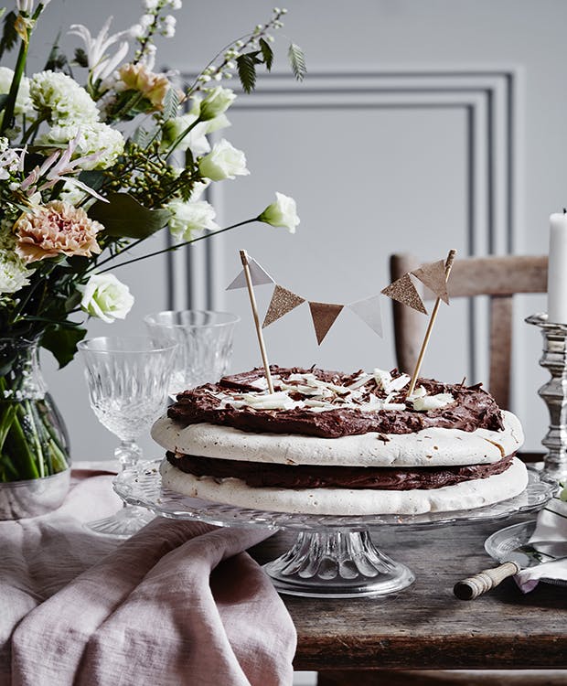 Grundstenene er marengs, chokolade og mandler - og så er den endda nem at lave. Klar, parat, bag!