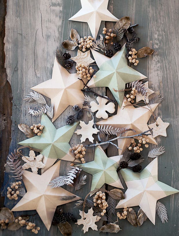 På artiklens billede har vi pyntet pænt på bordet med stjerner af papir, tapet og papirler. Der er desuden tørrede naturmaterialer som kristtornblade, hvid peberbær, bregneblade, kogler og grene, der er spraymalet hvide eller dyppet i stearin.