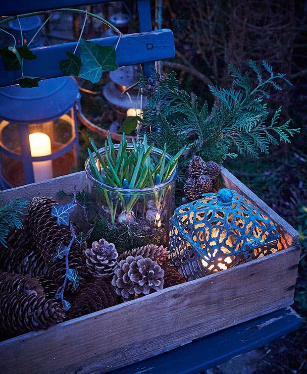På artiklens billede gemmer en gammel trækasse på bl.a. kogler og perlehyacinter, og det hyggelige stearinlys er med til at skabe den dejligste stemning.