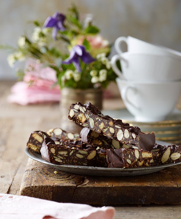 Chokoladebarer fungerer skønt på kaffebordet, eller som en dejlig snack i tasken. Disse lækre barer med knas er kun lavet af chokolade, kiks, kerner, frø og mandler - og det gør dem altså en del sundere, end dem du køber i supermarkedet. Du kan endda gøre den endnu bedre ved at vælge fuldkorns Digestive-kiks.