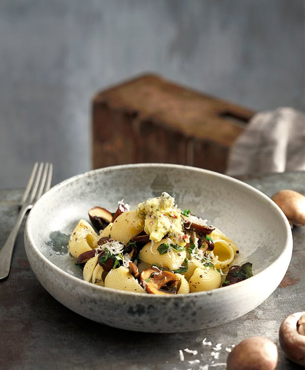 Lumaconi er en pastatype, der er formet som snegle og er hule inden i. Lumaconipastaen fungerer godt i retter, hvor de øvrige ingredienser kan virke som fyld i pastaen. Her serverer vi den cremede, skønne pasta med svampe og kryddersmør - lidt en hverdagsredning og opskrift får I her.