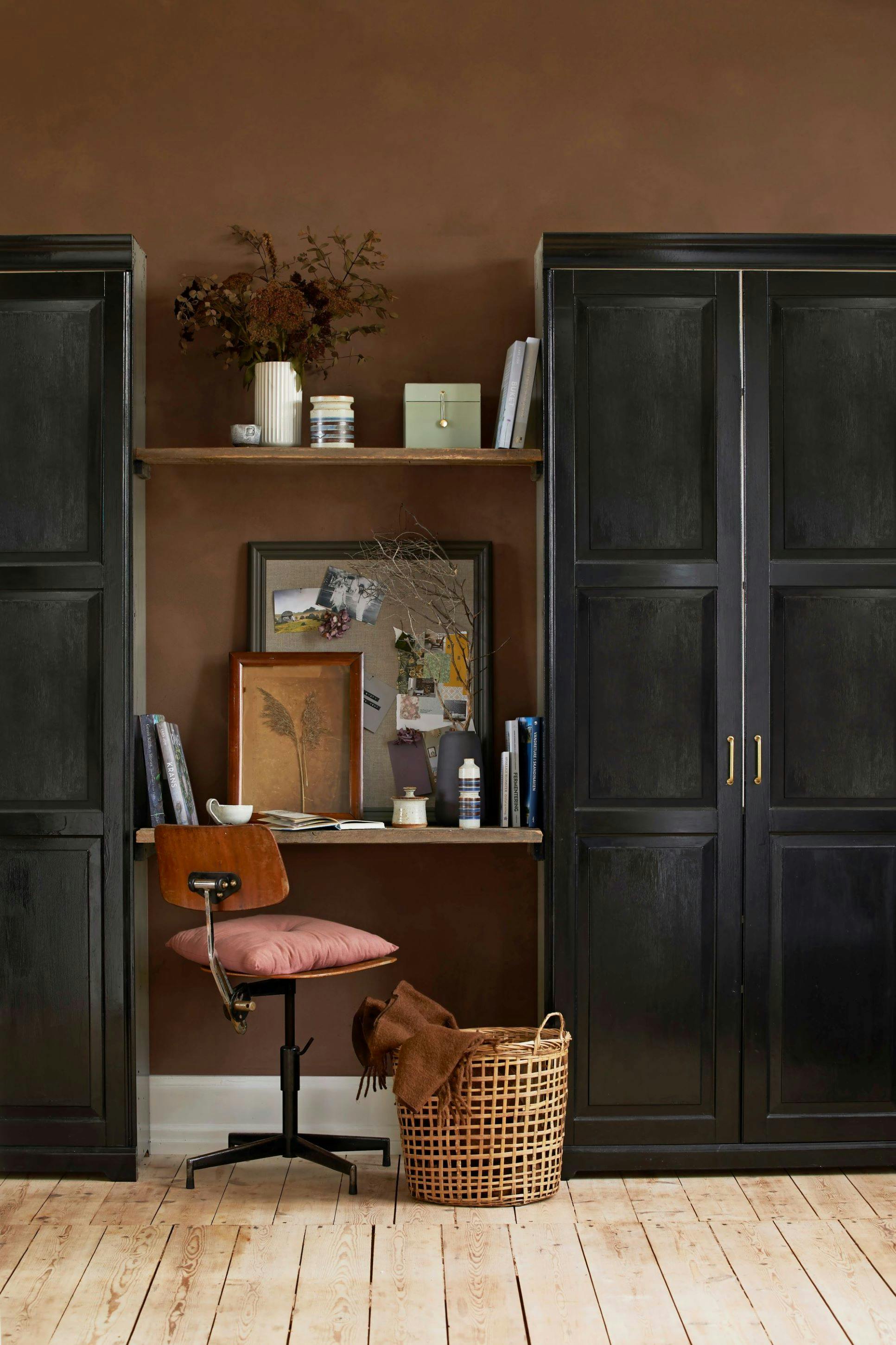 Er det småt med plads og penge, gælder det om at tænke smart, når man indretter sig. Her er en nem løsning til et indbygget skrivebord og hylde af genbrugstræ mellem to skabe.