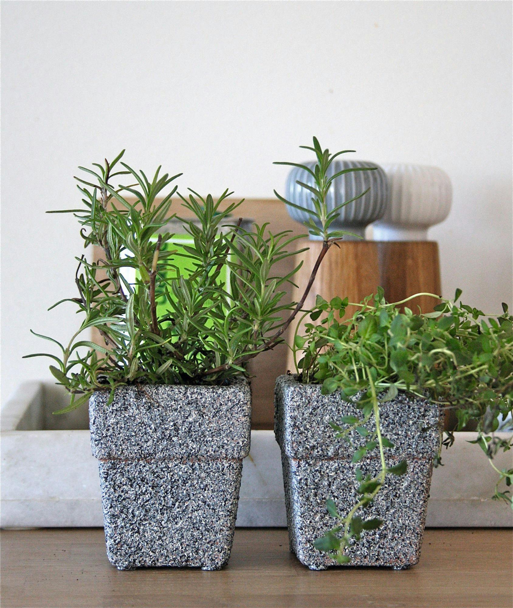De spraymalede lerpotter ligner ægte granitpotter, men er en hel del billigere.