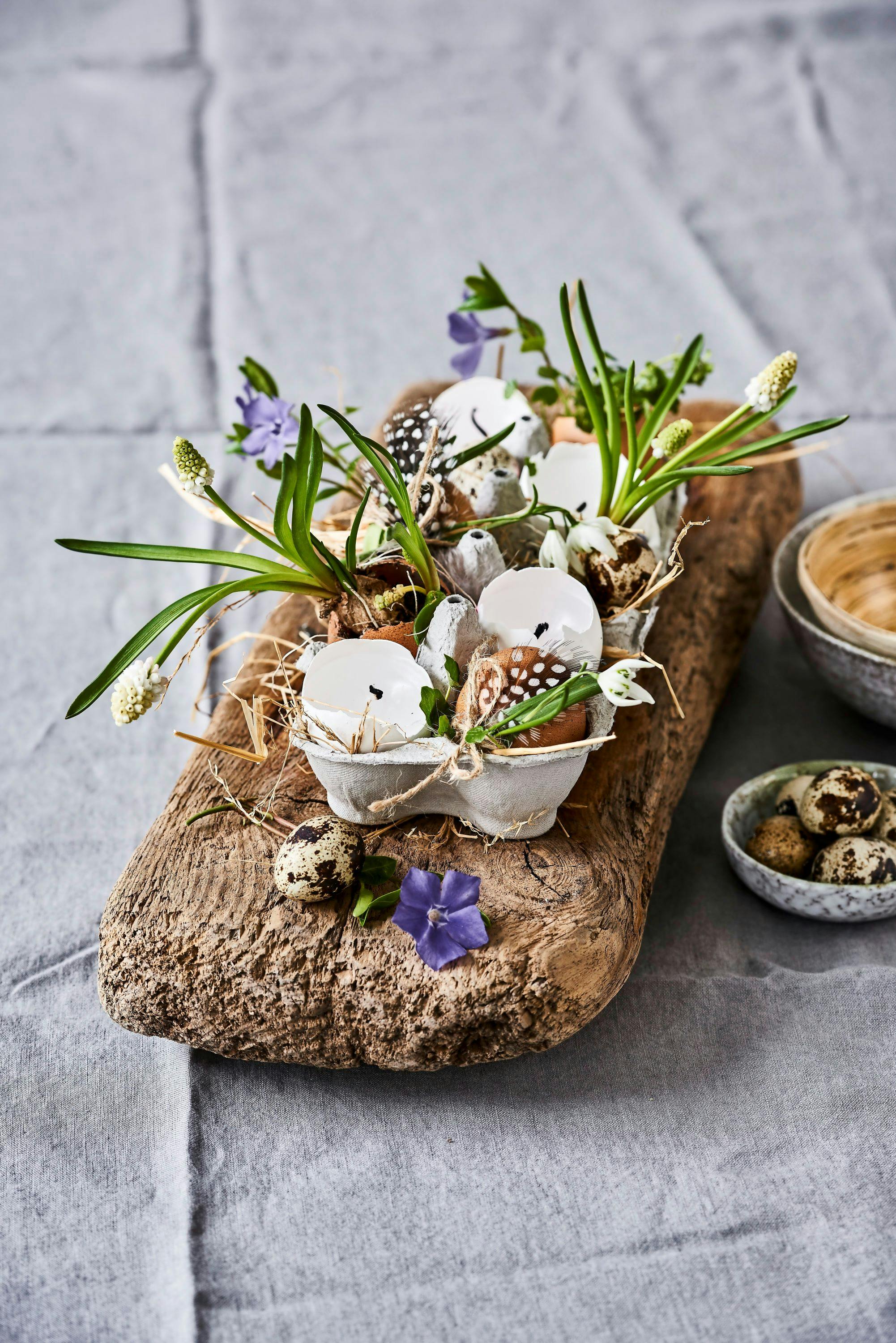 Kom lidt vand i æggeskallerne, og pynt med havens små påskeblomster som her perlehyacinter og snepryd.