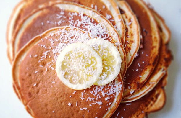 Alle ingredienser blendes godt i et par minutter. Bages som små eller mellemstore pandekager på en slip-let pande ved middelvarme Drys lidt kokosmel udover pandekagerne ved servering. Server evt. med lidt friske bær til.