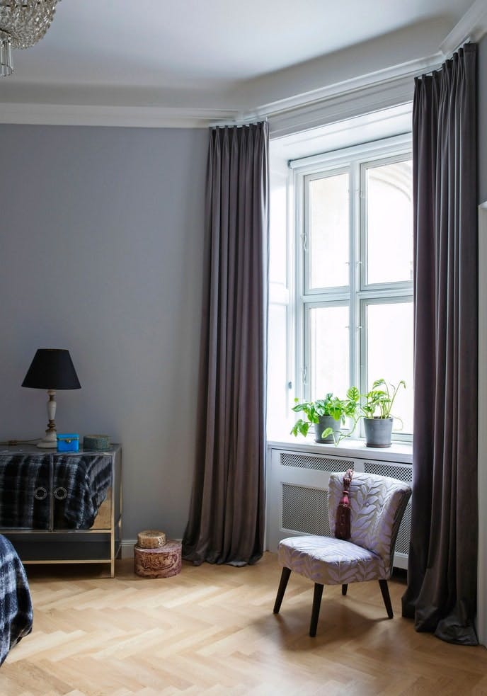 Gulvlange gardiner giver et luksuriøst præg, der er nemt at gøre efter. Gardinerne er fra Living Plus, syet i stof fra Designers Guild, og stolen er fra Designers Guild.