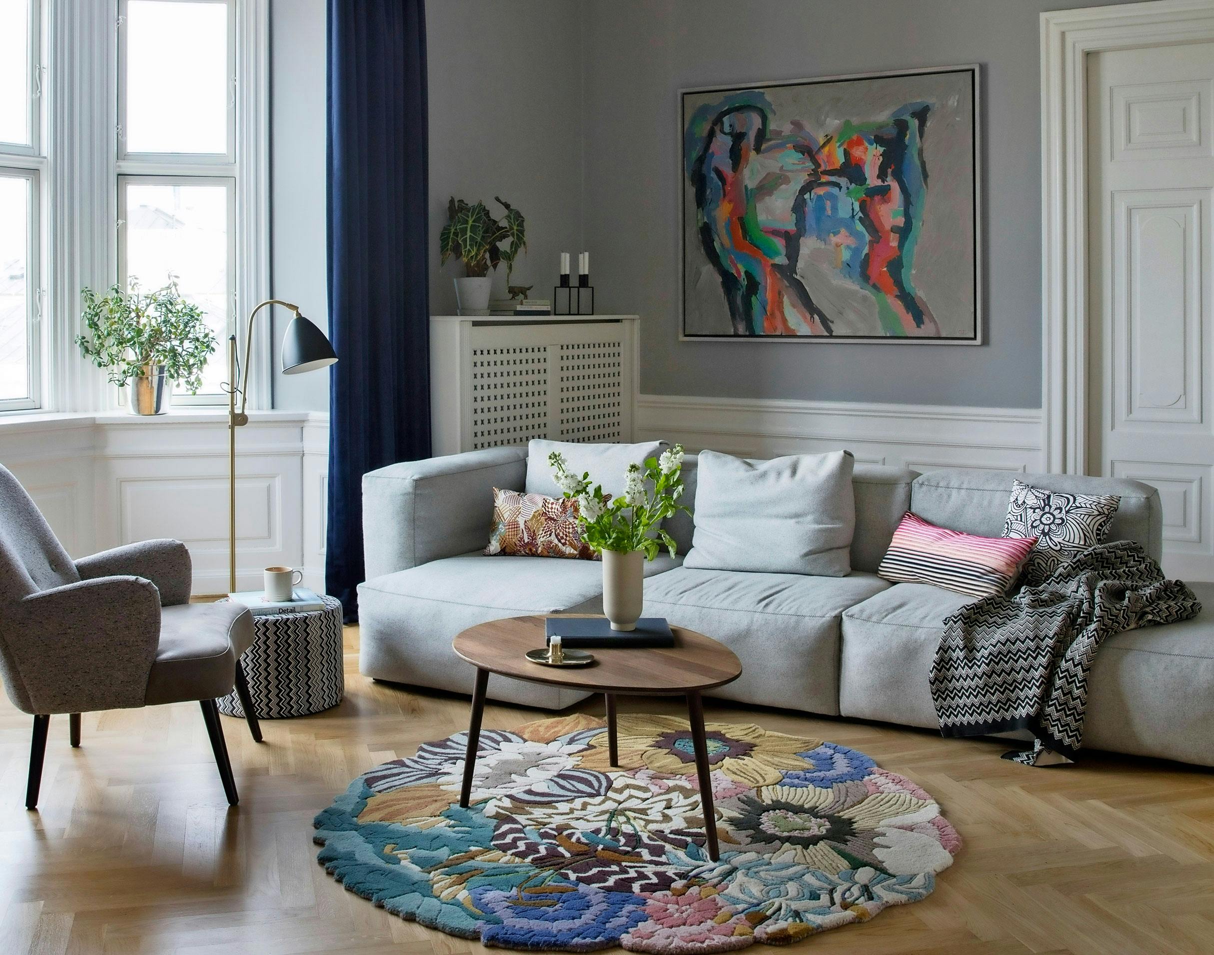 Brug farver på detaljer som tæpper, puder og malerier for at få lidt personligt spræl ind i en ellers stringent bolig. Lænestolen og gardinerne er fra Designers Guild, og bordet er fra Via Cph. Standerlampen er en Bestlite-lampe fra Gubi, og gulvtæppet er fra Missoni.