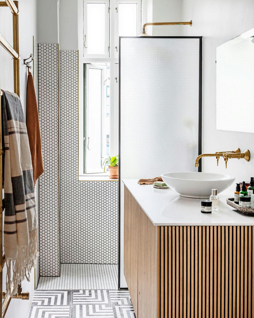 Du kan sagtens kombinere flere forskellige mønstre på badeværelset, uden det bliver rodet at se på, hvis du blot holder dig til afdæmpede farver og naturlige materialer. De mønstrede fliser er bestilt hjem fra udlandet, og møblet med træ-lameller er bygget af en snedker.