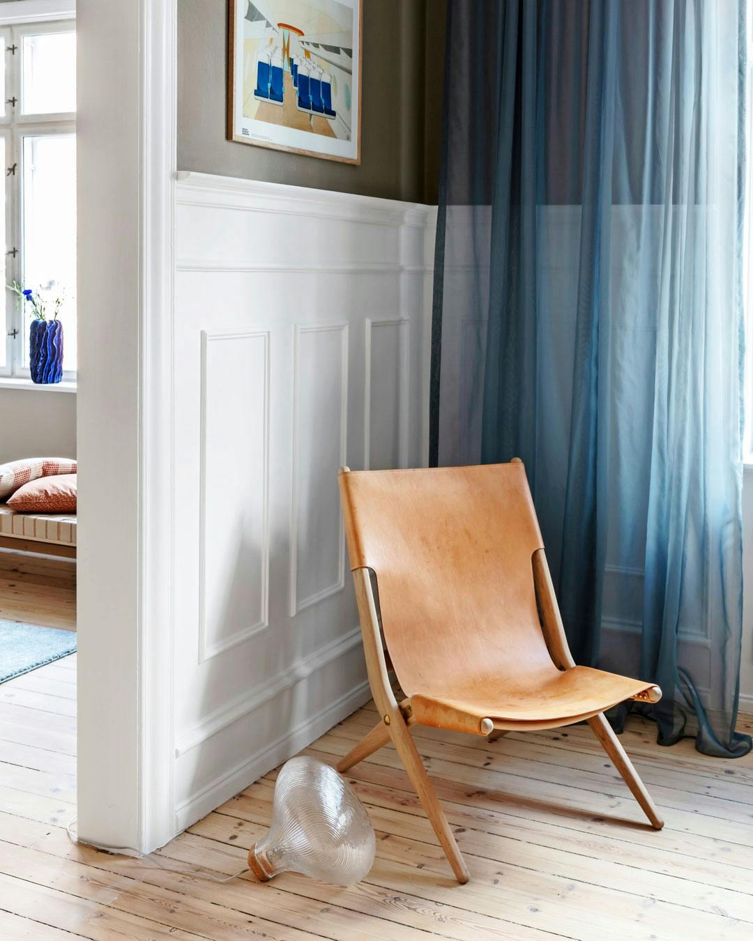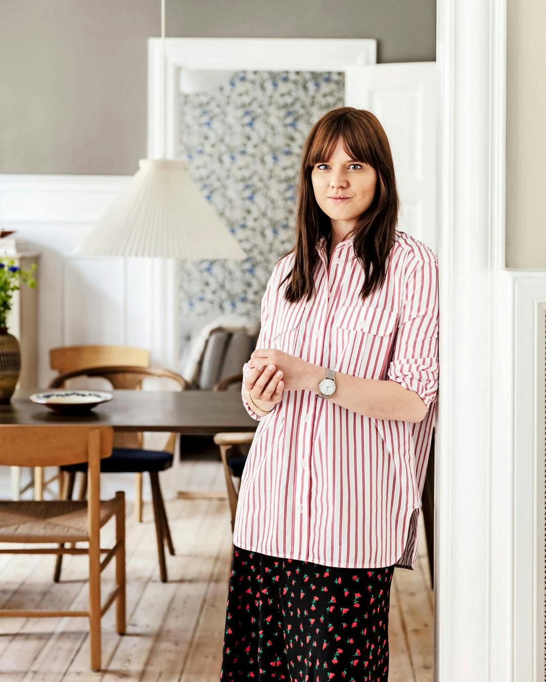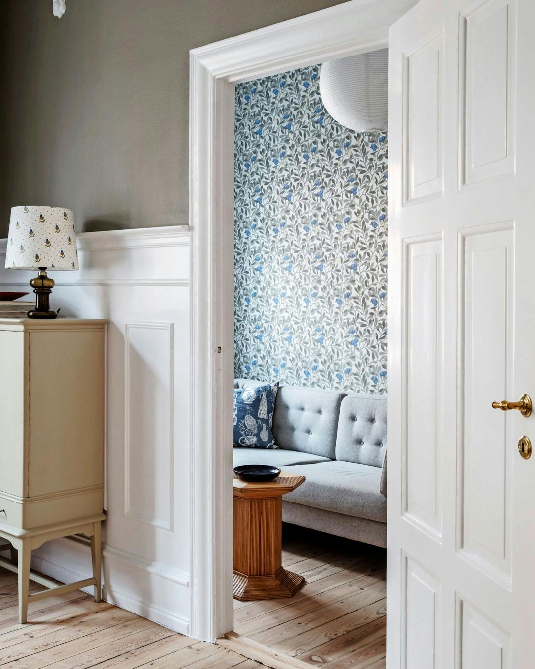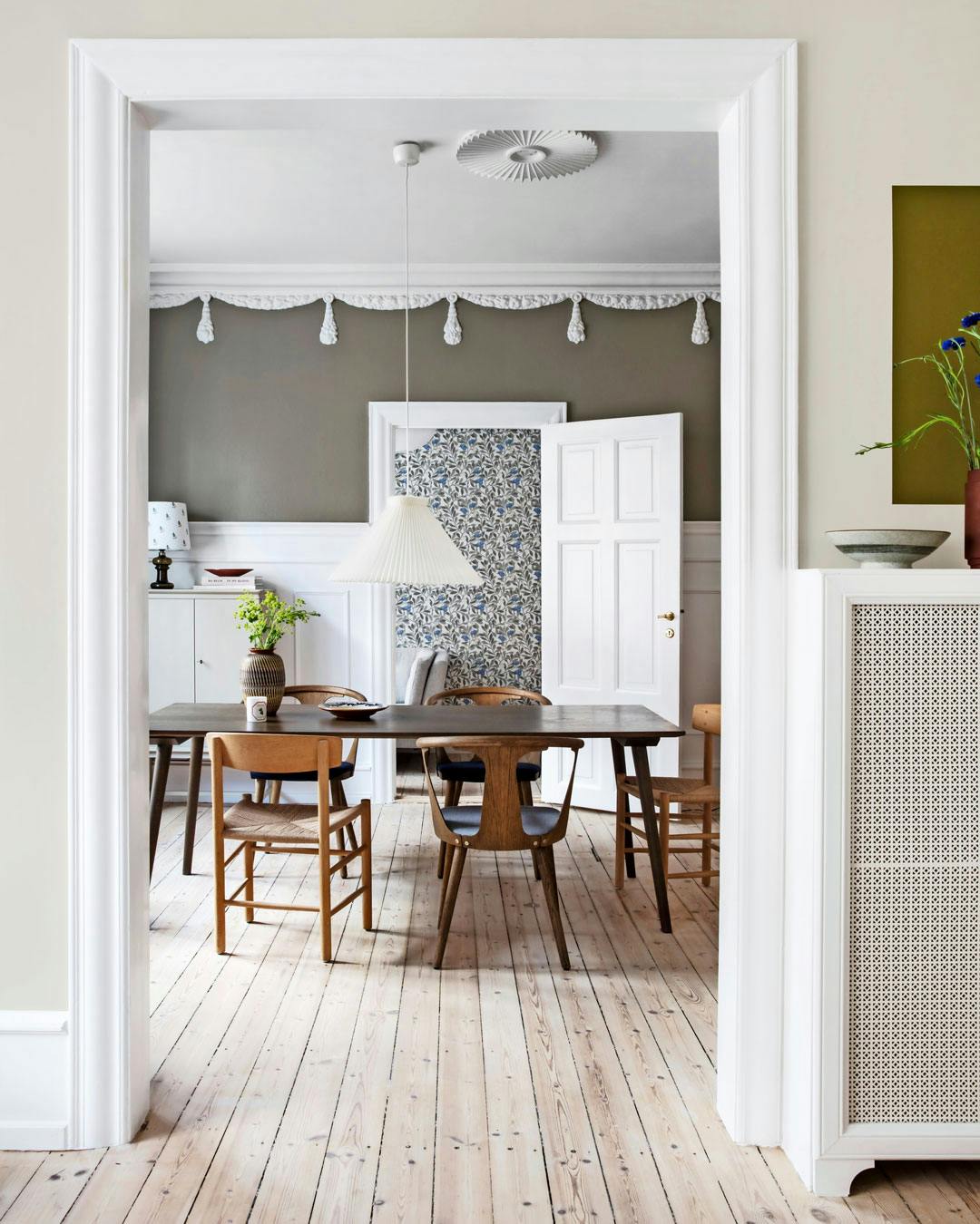 Tapetsér og mal væggene i toner, der matcher hinanden, hvis du vil fremhæve kigget gennem flere rum. Mette B. Seerup tapetserede endevæggen i det lille værelse i forlængelse af stuerne, primært for at få et flot kig fra sin sofa. Tapet fra William Morris og pendel fra Le Klint.