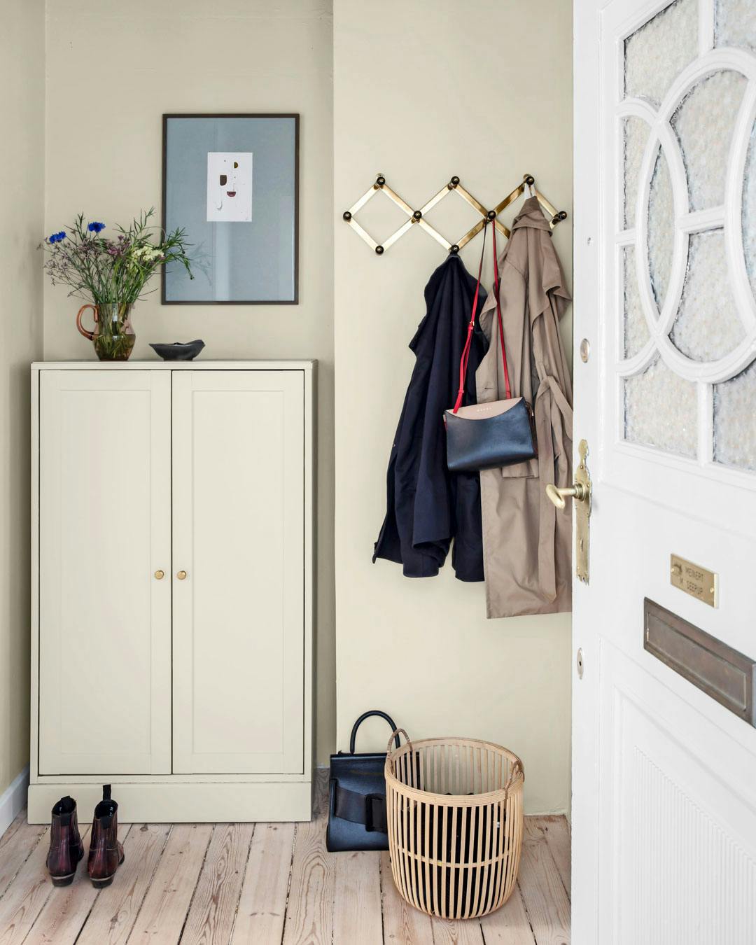 Har du en lille entré kan du male dine større møbler samme farve som din væg for at få møblet til at virke mindre tungt i rummet. Kurv og knage er loppefund.