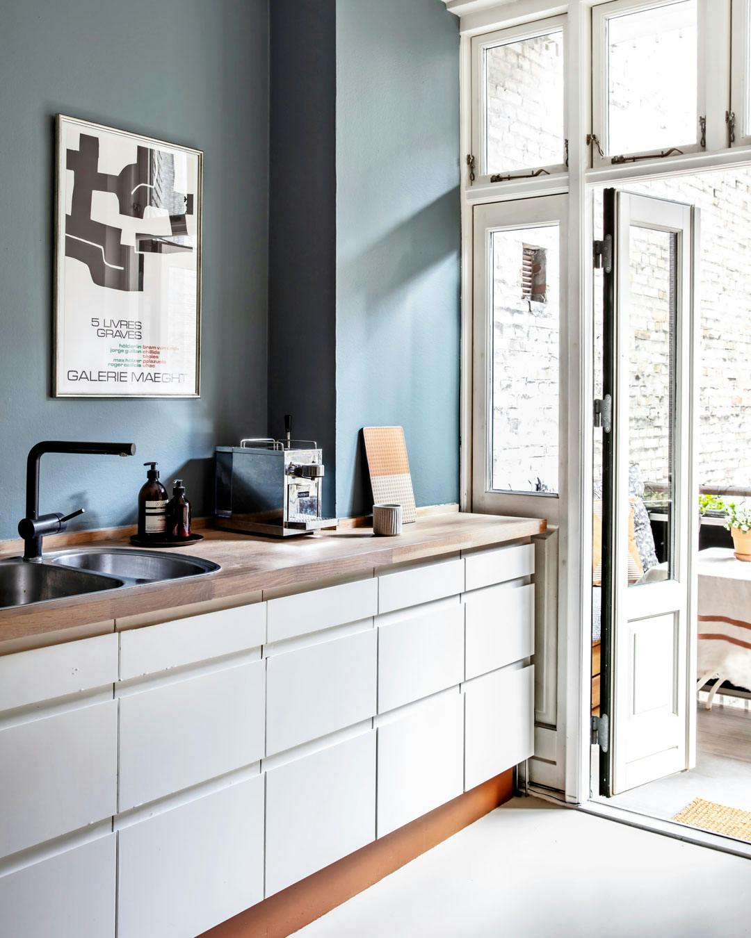 Parret drømmer om et nyt køkken med fronter i træ, men har frisket det gamle grebsfri køkken fra den tidligere ejer op ved at male både vægge og sokkel. Plakaten er købt på Galerie Maeght i Paris, og pladen i lavasten er fra File Under Pop.