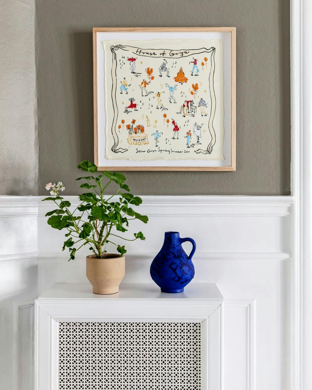 Et indrammet silketørklæde giver med sine syninger og lette krøller en helt anden effekt end kunst på papir eller lærred. Den blå vase er et vintage.