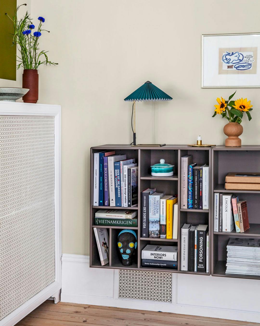 Tænk i kontrastfarver, når du vælger kunst til væggen. Til venstre har Mette B. Seerup malet en firkant direkte på væggen i stedet for at hænge et indrammet motiv op. Lampen er designet af Inga Sempe for Hay, messinglysestagen er af Ilse Crawford for Georg Jensen, og reolen er fra Montana.