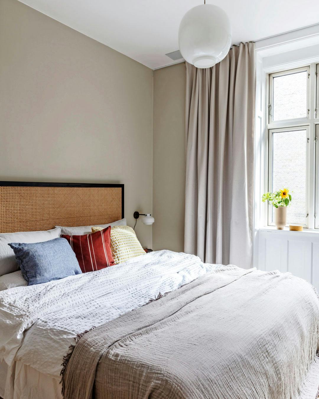 Radiohuspendlen fra Louis Poulsen blev designet af Vilhelm Lauritzen i 1940’erne til Radiohuset, som ligger et stenkast fra lejligheden. Radiohuset var også kærestens første arbejdsplads, hvor han var vært på P3 Nyheder i flere år, og pendlen har derfor en masse minder knyttet til sig. Puder fra Juna og FDB Møbler. Sengegavlen er hjemmelavet.