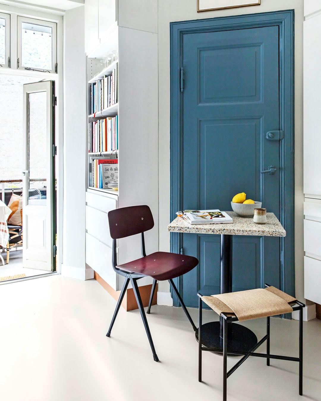 Fremhæv detaljer, som du alligevel ikke kan skjule. Her træder bagdøren frem i samme farve som køkkenets vægge, selv om den er blændet og derfor ikke har nogen funktion. På hylderne står en stor samling af kogebøger. Den røde stol er fra Hay, skamlen fra Skagerak, og bordet er hjemmelavet af en gammel bordplade i terrazzo tilsat en ny fod.