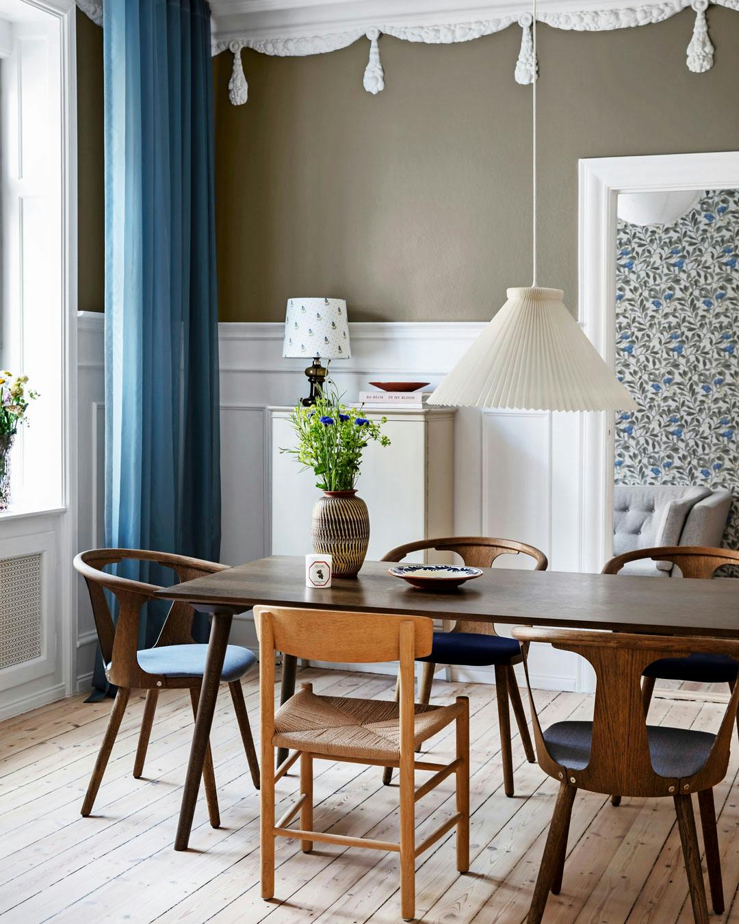 Spisebordsstolen In Between er designet af Sami Kallio i 2013 for &Tradition og betegnes i dag som en moderne klassiker. De flettede folkestole er af Børge Mogensen, mens de lette transparente gardiner er fra &Drape. Den grå vægfarve hedder Form og er fra Jotun.