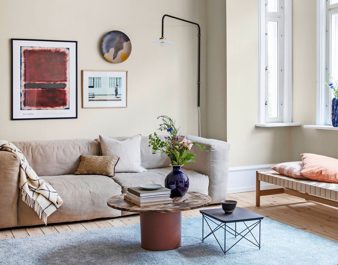 Flydersofaen er fra Hay tilsat puder fra H&M Home og Tapet Café. Over sofaen hænger et motiv af Mark Rothko, fotokunst af Christina Kayser O, platte fra Ferm Living og en skulpturel lampe designet af Muller Van Severen. Det lille Eames-bord er fra Vitra hos Paustian, og den blå vase er et arvestykke. Væggene er malet i farven Shaded White fra Farrow and Ball.