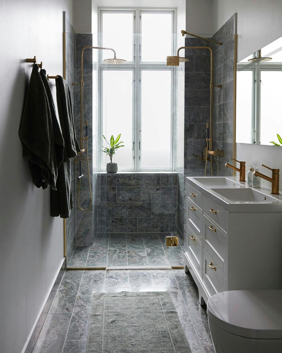 De modige og personlige valg er gennemgående for hele hjemmet, og selv på badeværelset har parret sat deres præg. Efter at have været omkring et marrokansk tema, der ikke føltes helt rigtigt, fandt de ved et tilfælde den grøngrå Kolmårdsmarmorflise, der i dag beklæder deres badeværelsesgulv og fortsætter fra gulvet op ad de store vægflader i brusenichen. Samtidig kunne Pernille Bang-Löwgren endelig få afløb for sin store messingpassion, da den grønne nuance fungerer optimalt mod det gyldne metal.