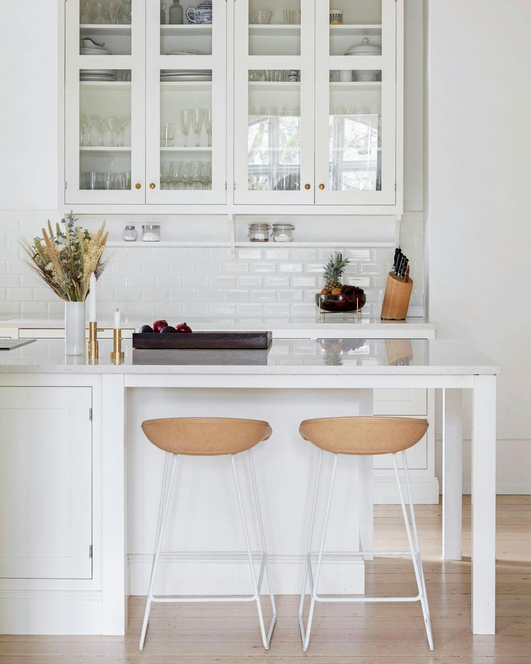 Klassiske materialer som hvidmalet træ, messing og marmor understreger den herskabelig stil, der matcher lejlighedens arkitektur. Selve køkkenet er fra Kvänum, barstole fra Hay og lysestager fra Fritz Hansen. Vase fra Excell. Skålen i baggrunden er fra Menu.