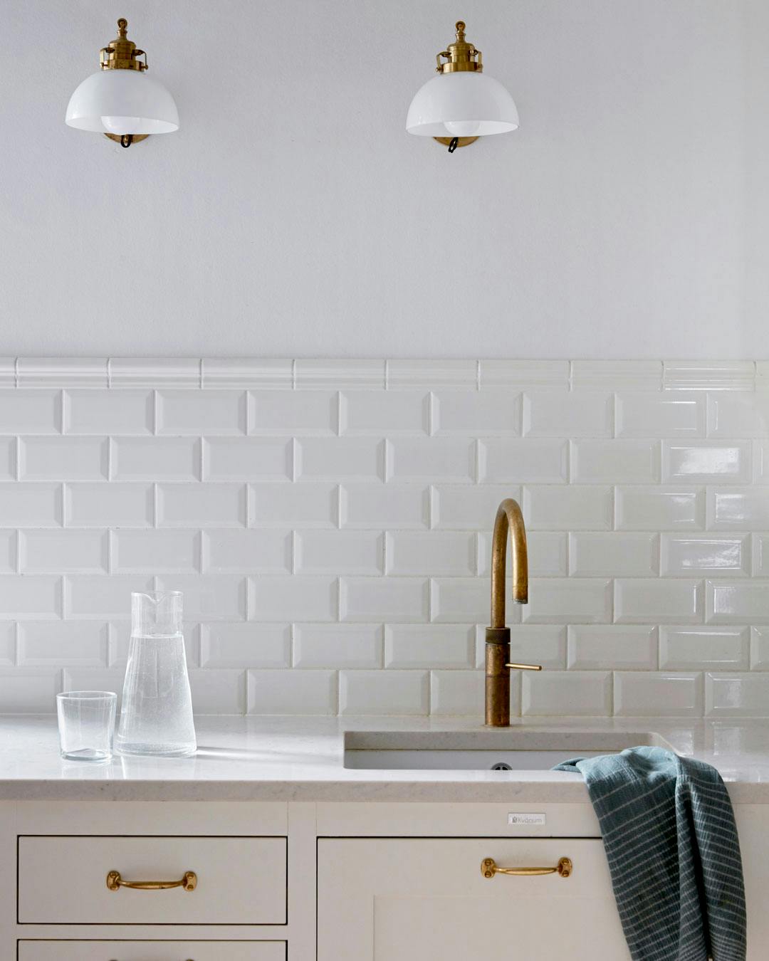 Et nøje overvejet udvalg af få materialer i et hjem giver et mere harmonisk udtryk. Parret, som er vild med messing, har valgt netop dette materiale som gennemgående på alle detaljer i både køkken og badeværelse. Køkken fra Kvänum, armatur fra Quooker, fliser fra Fired Earth og væglamper fra Karlskrona Lampfabrik.