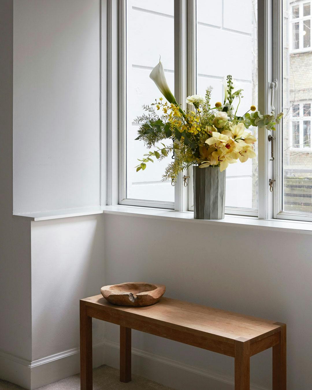 Overdådige buketter er en nem måde at tilføje ekstra liv i hjemmet. Sørg for at give stilkene på dine buketter et skråt snit med et par dages mellemrum. På den måde kan blomsterne bedre optage næringsstoffer, og din buket holder dermed længere. Buketten er sat i en keramikvase fundet hos en italiensk kunstkeramiker på en ferie. Bænk fra Ikea og træskål fra Illums Bolighus.
